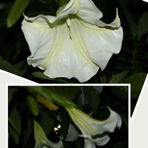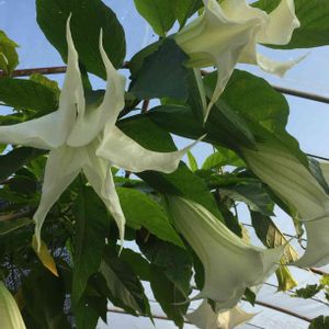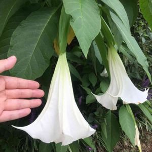 このユリのような、大きな昼顔のようなお花、何て名前ですか?教えてくださいませ~🍀⬅️「エンジェルストランペット(ダチュラ、コダチ(キダチ)チョウセンアサガオ)」ですね❗️教えて頂きありがとうございます🎵 全体に毒性がある有毒植物で、口にしないように。南米原産。8/9 8/16 9/4 10/23 の誕生花🌼 花言葉は「愛嬌」「偽りの魅力」「変装」です~🍀