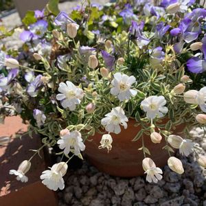ビオラと常緑草のアレンジを以前鉢植えしたもの。 いつもだとビオラやパンジーは、あっと言う間に、ダメにしてしまうのですが、今回は、長〜く楽しめています☺️ 白いお花、常緑草から咲いたものです。 購入した時は、名前を見たのですが、すっかり忘れてしまいました。 ちっちゃなちっちゃな風船のように膨らんでた蕾が、弾けて金魚草みたいなお花が咲いています☺️✨