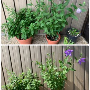 2023.5.13 撮影 我が家の鉢植えのキキョウ達 ⬅️:昨年種から育て、2年めの紫の一枝咲きキキョウ ウイルスに感染した1本を切ると、脇芽が出て きました😳❣️ 先日、旦那が横に立て掛けた傘の直撃を受けた様 で、葉っぱをムシられ凄くクネりました😳 が、元気です😸💞 ➡️:鉢ごと地植えし、4回越冬した白の八重咲きキキョ ウ😻💞 こちらもウイルスに感染してる所もありますが、成 長を止めてないので様子を見てます👀