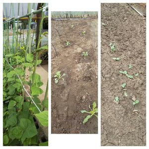 今朝の畑Aです。 左:インゲンは蔓がグングン伸び、支柱が足りなくなりそうです。 中:一昨日植えたばかりのフウリンソウ。植幅が狭すぎるとの義姉#1のチェックが入り2列にしました。 右:撒いた覚えのない芽が点々と。多分、割れたかぼちゃから落ちた種が芽をだしたのかなぁ。無欲な方が上手くいくのね。