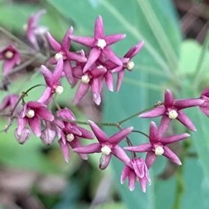 クサナギオゴケ(草薙尾苔) キョウチクトウ科 カモメヅル属 華やかではないけれど、里山の林縁斜面に咲く 佇まいは美しく~この地で静かに咲き続けてほしい お花デス ♡ 直立した茎の下部に、大きめの葉が対生して付いていて~茎先が伸びるにつれてつる状になるようです‥👀!! 茎先や上部の葉腋から針金のような花序を出して、 直径8㍉位の濃紫色の花をまばらにつけて咲いていました‥💜💚 花の構造は~フナバラソウ、スズサイコに似ています‥👌 ③ 花冠は星形 で5深裂、副花冠は環状で5裂、真ん中に雌しべがあって雄しべが筒状に合着した蕊柱(肉柱体)が見えています‥👀!! ✴ 日本固有種で、絶滅危惧種 愛知県瀬戸市(旧品野村)で 最初に発見され~ 尾張に関係深い熱田神宮の御神体の一つとなっている草薙ノ剣(くさなぎのつるぎ)に因み 「クサナギオゴケ(草薙尾苔)」と、名づけられたそう… オゴケは袋果が麻糸を積みためる容器 苧小笥(おごけ)に似ていることからだとか‥📝 ⑤ 雨上がりの里山はウグイス、ホトトギスが鳴き~畔にはキジが、スギの樹上にはオオヨシキリも。。。気持ちの良い散歩デシタ♡