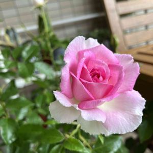 雨の1日でしたが バラがニッコリ咲きました。 真ん中がピンクで外側が白い 素敵なバラです。 音楽家としては アダージョと聞いて はいよ!とポチッとネットで注文しましたが、とっても元気な株が届きました。香りも品の良い爽やかな香りです!