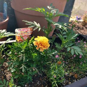 マリーゴールド ストロベリーブロンド🍓 アンティークな色がとっても可愛い💕 夏から秋にかけて花色が変わるのも魅力です🏵 昨年種をとってありましたが あ〜また蒔くの忘れたぁ! でした😅 なんと!こぼれ種から、 花壇の外に咲いてくれました〜🧡 時々踏まれた形跡ありですが🤣 良かった💕嬉しいなぁ(◍︎•ᴗ•◍︎)♡︎ʾʾ