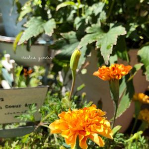 おはようございます☀ 定植して1ヵ月程経ったマリーゴールドストロベリーブロンド🍓とワイヤープランツの寄せ植え💕 ビタミンカラーに癒されます🧡💛 後で気がつきましたが、お気に入りのプレートが逆さまです😂😂 笑けます🤣🤣 今日も熱中症にお気をつけてお過ごしください✨