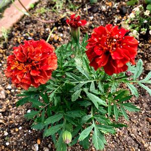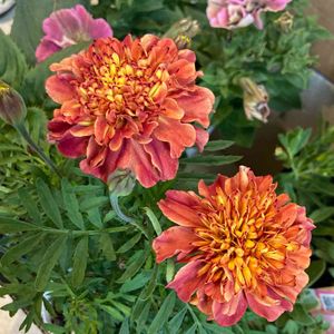 フレンチマリーゴールド ストロベリーブロンド 少しずつ咲いてきました。渋い色じゃありませんか?葉も主張し過ぎないところも良いなと思ってます。マリーゴールドは昔から知っていましたが、こんなにお洒落に進化しているんですね😂