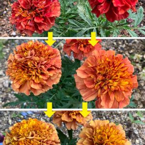 マリーゴールド ストロベリーブロンド 開花時→1週間→2週間の色の変化です。 😊赤味が薄れてブロンドヘア💃になるんですね〜。 今日は蚊が多いです💦 もう夏🌻になっちゃいますね