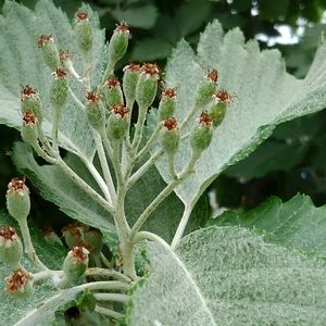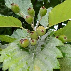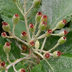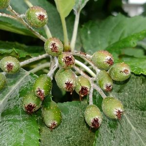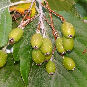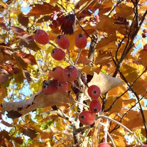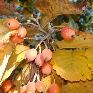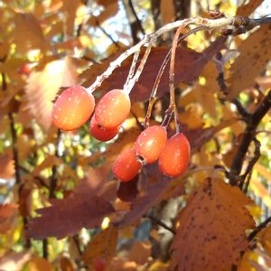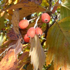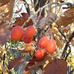 赤黒く紅葉した葉っぱの間に1cm位の実がついています😍 これウラジロノキですね。 実が倍くらい大きい仲間があって、そっちはオオウラジロノキといいます。 バラ科リンゴ属なので、用語的にはナシ状果といいますが、リンゴによく似てて食べると酸っぱいです。あまり美味しくはないですが、果実酒にはピッタリです🍈 ご覧のように短枝の先の葉🍃は、オオウラジロノキと違って束生します。