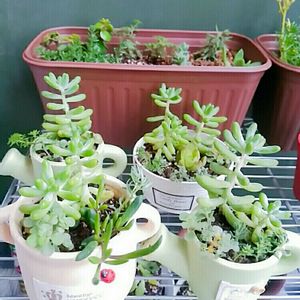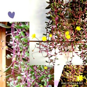 🏷ネックレスの日🏷 セダム・ルペストレアンジェリーナと一緒、、ゴッチャ植えの キク科オトンナ属●ルビーネックレス 黄色のちっちゃい花が咲いています 吊り鉢に植え替えて 垂らしてあげたらいいんだけど、、、、また 今度ね😅 ネックレス系にはセネシオ属の ⭐️グリーンネックレス(➕斑入り) ⭐️アーモンドネックレス ⭐️ドルフィンネックレス ⭐️三日月ネックレス ⭐️ピーチネックレス ⭐️エンジェルティアーズ などなど〜 オトンナ属の「ルビーネックレス」は 茎も赤紫色で 綺麗に紅葉すると その名の通りルビー色に💕 流通名 紫月、黄花新月、オトンナ・カペンシス カペンシスの変異種が ルビーネックレスかな???????