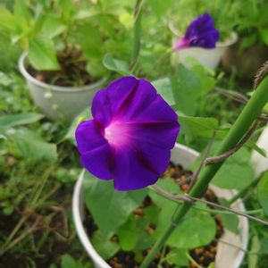 朝顔(あさがお アサガオ) ポットから鉢植えにやっと出来ました😁 オベリスクと支柱で行灯仕立てにする予定です😂