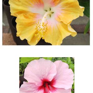 ハイビスカスやっと2色揃って咲きました。 小さな鉢に植え替えたのだけど、去年より、花色が良くなったみたい❗️👍️🎶🎵