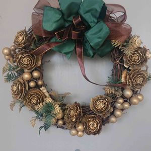 2023/12/6 撮影 in九州 「アンティークリース」 リメイクしました。 かれこれ…約15年位前だったかな。雑貨屋さんが次々と閉店しちゃってた時期で…X'masシーズンではなかったからか?売れ残ってて…当時のリボン🎀とroseが気に入り…購入。(当時は鶯色のリボンだった) 今年はいよいよ新しくgreenのリボン🎀に付け替えて、ジョソーニアのゴールドをペチョぺちょ塗って…リフレッシュ・リメイク。 リースを作った人…まさかこんなにも永く愛用されてたなんて知ったら驚くだろうな。 リース好きには消耗品だとは思えないのです。 立派な芸術品。