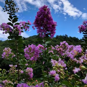 サルスベリ(百日紅)🌸 青空が似合う花、つるんとした白い枝とモフモフの花😘 バラ公園の通路側に❤️🤍💗3種類のサルスベリが咲いてます🤗 🏷️蒼い空 🏷️モフモフの木曜日 🏷️木曜日は木に咲く花