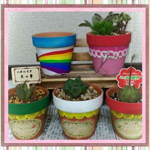 果敢にもリメ鉢に挑んでみました🌼*゚ 娘が学校で使ってるアクリル絵具を借りてるから遠慮しながら💦笑 もっとゴージャスにしていきたいなー😶 下段真ん中は新入りハオちゃん🌱 ……って、札がないから分からないけど、ハオルチアだよね❓❔