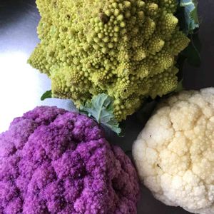 オットの菜園で収穫したカリフラワーズ。 紫のものは茹でると色が抜けてネズミ色に🐀💧 加熱してもこの色を損なわない方法はないでしょうか😅❓