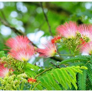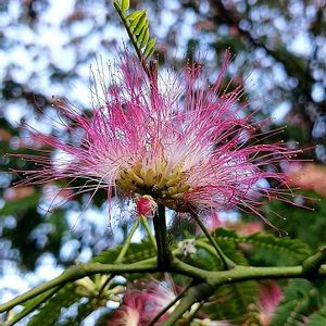 モジャモジャ もやもやふわっ ツンツンシャキ パッと開いて花火の様 鳥の落し物から三年 今年初めて咲きました 二階から見ると大きく枝を広げているネムの木です😊🎶💓