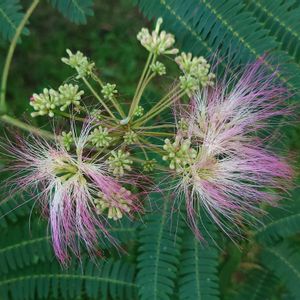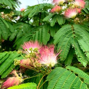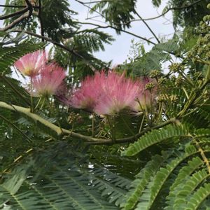ねむの木のお花が ふわふわと可愛く咲いていました🌸 散歩道にて 調べました。 植物名 ねむの木(ネムノキ、合歓木) 学名 Albizia julibrissin 英名 silk tree,silky acacia,Japanese mimosa 和名 合歓木 科名 マメ科 属名 ネムノキ属 原産地 日本 ねむの木(ネムノキ、合歓木)の特徴 ねむの木(ネムノキ)はマメ科ネムノキ属の落葉高木です。地植えにしておくと10mくらいにまで大きくなります。日本の風土に良く合い丈夫なことから、庭木の他、公園や寺社などにも好まれて使用されます。山野に自生していることもあります。 ねむの木(ネムノキ)の特徴は、水鳥の産毛のようなふわふわとした花と、葉の就眠運動です。花は花芯近くの白から、花びらの先端に向かって淡いピンクへとグラデーションが付いているのが印象的です。ふわふわとした淡いピンク色の花が高木の上の方の枝に咲いている姿は愛らしく、いつまでも眺めていたくなります。 もう一つの特徴である葉の就眠運動とは「ねむの木(ネムノキ)」の名前の由来にもなっているものです。ねむの木(ネムノキ)の葉は、鳥の羽に似た形状の羽状複葉(うじょうふくよう)です。羽状複葉とは葉柄の両側に小さな葉が羽のように広がっている様子を言います。ねむの木(ネムノキ)の名前、は夜になるとこの葉を眠るように閉じることから付けられたと言われています。「合歓木」という漢字も、中国ではこの葉を閉じる様子を夫婦円満に見立てて名付けられたと言われています。 園芸分類 庭木、落葉 草丈・樹高 10m 耐寒性 強い 耐暑性 強い 花色 ピンク 開花時期 6~7月 ねむの木(ネムノキ、合歓木)の育て方のポイント 日常の管理 ねむの木(ネムノキ)は風通しが悪いとカイガラムシが付きやすくなります。こまめに枝の裏側や葉の裏をチェックするようにしましょう。見付け次第こそぎ落とすようにします。 水やり 庭植えのねむの木(ネムノキ)は根付いてからは特に水やりの必要はありません。乾燥が数日続いた時は株元にたっぷりと水やりを行います。 鉢植えのねむの木(ネムノキ)は表土が乾いたらたっぷりと水やりを行います。 肥料 ねむの木(ネムノキ)は他のマメ科の植物と同様に、根粒菌と共存関係にあります。根粒菌がいることで土壌が肥沃になりますので、とくに追肥の必要はありません。 鉢植えのねむの木(ネムノキ)は開花前に緩効性肥料を施します。 病害虫 風通しが悪かったり、日当たりが悪いとカイガラムシが付くことがあります。見付け次第こそぎ落します。 ねむの木(ネムノキ、合歓木)の詳しい育て方 選び方 ねむの木(ネムノキ)の苗木は、葉がまばらになっていないもの、葉付きが良いものを選びましょう。 植え付け ねむの木(ネムノキ)の植え付けは落葉期が終わり、芽吹き始める前の3~4月頃に行います。 剪定・切り戻し ねむの木(ネムノキ)の剪定は2~3月、厳寒期を避けた落葉期に行います。落葉期に余計な枝を落とし、樹形を整えます。大きくしたくない場合はこの時に強めの剪定を行います。 その他の季節は枝が混みあったら間引く程度にしましょう。 植え替え・鉢替え ねむの木(ネムノキ)は根をいじられるのを嫌います。鉢植えのねむの木(ネムノキ)は2~3年に一度、1~2回り大きな鉢に植え替えます。このとき根鉢を崩さないように注意しながら植え替えます。 花 ねむの木(ネムノキ)の花は初夏6~7月に開花します。水鳥の産毛のようなふわふわとした淡いピンク色の可愛らしい花です。 冬越し 冬になるとねむの木(ネムノキ)は落葉して越冬します。霜が多い地方では霜除けのマルチングを行いましょう。 山に自然に観る ねむの木は 高木にて遠くにお花を見ていましたが このお花は まだ2メートル位の低木にて お花を間近で観る事が出来ました。 ふわふわした ピンク🩷のお花が とても愛らしい😊🌸🍃キュン💘 今日も素敵な一日をお過ごし下さい🥰