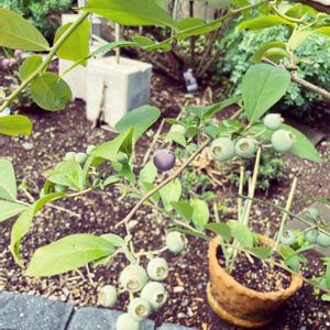 色づき始めた🟣 ブルーベリー専用の土に植え替えただけで肥料も何もあげてないけど、今年は鈴なり(*´꒳`*)