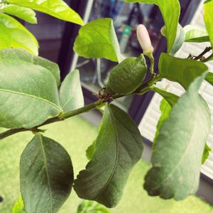 レモンらしい形になってきた🍋 そしてこの時を狙ったかのようにアゲハの幼虫がわらわらと葉についてた(強制退去