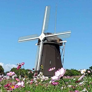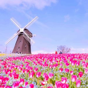 大阪市にある「風車の丘」🌷 春風を受けて回る風車の手前に、富山県砺波市産のさまざまな色のチューリップが整列して咲いています…♡ ・ チューリップの根元にはネモフィラが一面に咲いておりとっても綺麗で癒されました…✿ᵕ̈* ・ (撮影 2020 3月)