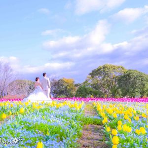チューリップ畑に新郎新婦…🌷🌷 3月のまだ寒い状態でしたが、花嫁さんはドレス姿で撮影頑張っておられました…♡ 見てるだけでほのぼの癒されました…✿ᵕ̈* 末永くお幸せに…♡