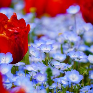本日のお花、ネモフィラさんです☺️ 赤いチューリップにも囲まれて華やかです🌷🌷🌷