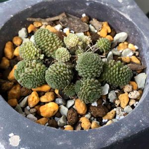 おはようございます♪ モナンテス属 ポリフィラ(綴化) もこもこに盛り上がって綴化しています😍 黒っぽく影になっているところは下から板状のつぶつぶになってその上に丸い子が沢山つらなっています!ほんとに繊細で可愛いです😍 あ〜〜!実に不思議な多肉さん😍✨♥️