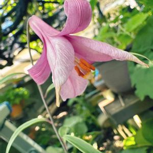 ジンリョウユリ ユリ科•属 開花見込み球根だったが 2年目にやっと咲いた。 ササユリの変種 花被片の赤みが濃く細い☘️🌱に白い覆輪が入る。 徳島県神山町神領で見つかった。