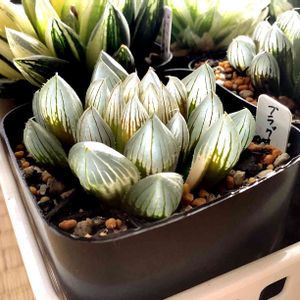 みんな揃って〜パシャッ! Σp[【◎】]ω・´) 奥2つ①②は1月5日お迎え 葉数も大きさも1ヶ月で倍になりましたw 花芽も各2本ずつ上がっています もうじき開花です! 真ん中③は先週お迎え 悲報です…青光りしなくなりました(T^T) まだ根張り活着が出来ておらず 吸水出来てないので水切れ起こして 透明窓が萎れてきてしまったせいです よって…この子は溶かし潰さず ぶりんぶりんに育てる方針にした! 手前④⑤は一昨日お迎え 根がしっかりあったので早期根張りに期待 1ヶ月後にはパッツンパッツンにしたい! そして…もう1株…お控えがございますw