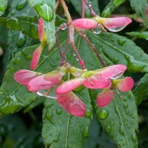 花散歩 雨の日の楽しみ①☔ ❣️🫧🌸🫧🪽🌹💧⚪🫧♪ 1️⃣紅葉 赤いタネコプター キラキラ🫧 2️⃣八重桜 まだまだキラキラ 3️⃣鳩が〜 飛んだ🪽 4️⃣薔薇 の💧 5️⃣灯台躑躅 白がキラキラ🫧 今日も 笑顔😄で 過ごせますように💐