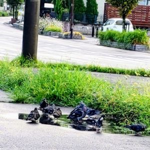 草むら エノコログサ メヒシバ ハト 昨日の早朝、水溜りの鳩。 早朝会議か、水浴びか。水飲みか。 この後、いっせいに飛び立ち、電線に。