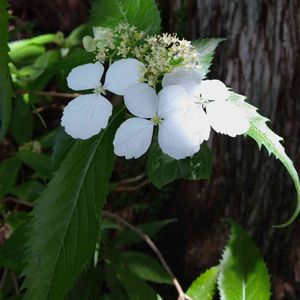 ヤクシマコンテリギ(屋久島紺照木) ユキノシタ科アジサイ属 ヤクシマアジサイの品種 白い装飾花の縁に凸凹があり、葉の先が尾状に尖り鋸歯状になっています。両生花は薄黄色をしています。 鹿児島県屋久島町、千尋滝の近くに咲いていました。 屋久島だけに自生している珍しい花です。