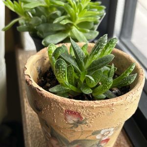 多肉寄せ植え挑戦第二弾 ハオルチア4きょうだい(見切り品各50円)がなんとか見られる容姿になったので植えてみました 十二の巻、ピリディナータ、レディ、小人の座(裏側で見えてない笑)です 元気に育ってくれると良いなあ