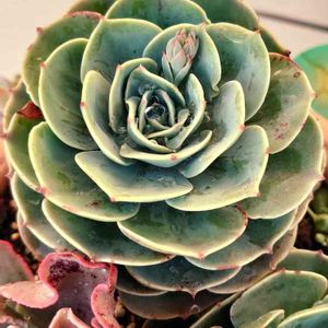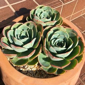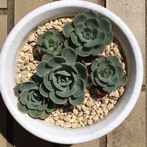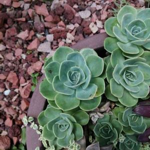 エケベリア、七福神を真ん中に。 エケベリアの女王はカンテ 。 エケベリアの王様はメキシカンジャイアント。 エケベリアのお局は七福神。 最後のは私の主観です。