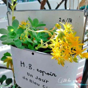 こんばんは~♡ 多肉ちゃんのお花❇️❇️❇️ 主人の野菜苗の温室で冬越しした子です😊.·*♪·.*·♥ この鉢❇️実は蚊取り線香をたく容器です😁