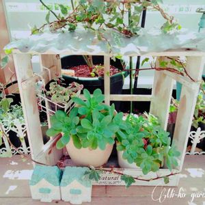 こんばんは~♡🌿 🌿多肉ちゃん🌿のお家です❇️ 屋根からぐるりと這わせたヘデラちゃんが青々してくるに期待中.·*♪·.♡(*^-^)