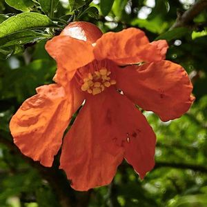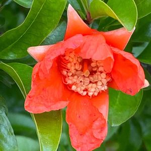 石榴のお花 おぉ〜咲きました。艶やかな緑の葉っぱ🌿の中に鮮やかなオレンジ色です。 蕾をつければ咲くのを楽しみにして、咲けば実のなるのを楽しみにする。 朝の散歩が楽しみです🧡💚