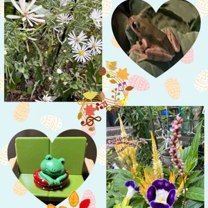 🏷毎月15日はインコの日に参加⸜(*ˊᗜˋ*)⸝セキセイインコ🦜 ②ヤツデの花 少し開きかけてると…香りが🐽😱😖…何処からかハエ🪰がヨッテクルノ 少し可哀想だが撮影終了後茎から✂️を③ ヒメツルソバ☆何処からか飛んで来たのね💕︎ 気をつけてね!花壇に入って来ると…たまには間引かないと占領されますよ('∇^d)☆!!④オキザリス♡可愛い🫧🎀この子も球根だから増える♪ ⑤ホトトギスやっと満開にと喜んでたら͛.*🍃強風で可哀想な姿に…頑張って咲いてくれたので記念写真