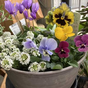 おはよう御座います😊 昨日、職場の上司からブルーのシクラメン入れて寄せ植え作ってとお願いして作って頂きました😍 フリフリビオラを入れてとそれだけの希望で後はお任せ可愛い寄せ植えができました❣️ 仕事場の花代は300円 シクラメン入れてても500円と安く出来ました👍