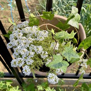 部屋で育てていたアイビーが伸びすぎたのでアリッサムと寄植えしてみました! なんか寂しいので色花を加えたいと思っています🩷💛