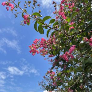 ①②百日紅 (サルスベリ) 青空に映えて まるでピンクの木💕 ③ヘリオプシス バーニンハーツ🌼 沢山咲いています🌼🌼 ④モミジアオイ🍁 次から次へと咲いています ⑤ブルースター 何回も咲いて楽しみぃᕱ⑅ᕱ♥💙