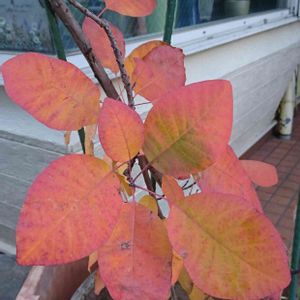 ぉはよぅございます あっ 綺麗😍と 「くれぐれも、触らぬ様に❗」 *ハグマノキ*白熊木 *ウルシ科 コティヌス属, 学名:Cotinus coggygria 落葉小高木 英名: smoke tree 原産地 :ヨーロッパ、中国 開花期 :5~8月 花の色 :淡緑、赤紫、ピンク 別名:煙の木(ケムリノキ) 霞の木(カスミノキ) 和名:白熊木(ハグマノキ)は 花後、花柄が伸び白い毛が生えて煙のように見える姿を、 仏具(払子ほっす)の先の ハグマ(白熊-ヤクの尻尾)に 見立てたことに由来するという。 葉は枝先に束生し、葉身は卵円形で葉先は尖らず縁は全縁、側脈は明瞭で幾つか分岐して縁に達する、葉柄は長く赤味を帯びる。 花言葉:「賢明」「*煙に巻く」 「*にぎやかな家庭」 「*はかない青春」「憂い」「後悔」 「*煙に巻く」は、花が咲くと木から煙が上がった様に見える事からつけられました。 「*はかない青春」は、煙がすぐに消えてなくなるさまを、短い青春に例えたことに由来しています。 紅葉した葉は 「*にぎやかな家庭」を 連想しますね ( ˙ ˙˵ )♪(*˙ᵕ˙ *)🍠🍂 (っ'-')╮ =͟͟͞͞🍎🍏ブォン