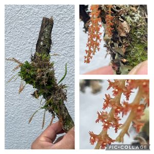3月の後半くらいに買って枝コルクに付けた デンドロビウム ストリオラタ(ストリオラタム)に花が付いてた❗️ 棒状の葉がデンドロっぽくない🫠