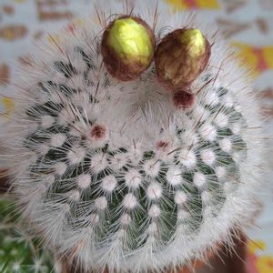 今年、ホムセンで購入した「白小町」のラベルが付いたサボテンが咲きました(写真1) 花の大きさは直径4cmほどです 花弁は黄色、雌しべは赤く、この株では雌しべの先端は9つに分岐しております(写真2) 白色のサボテンですが、つぼみの表面は褐色です(写真3) 上部の刺座は白色ですが、中央〜下部の刺座は少し着色しております 縁刺は白色ですが、中刺の先端は少し着色しております(写真4) 一方、つぼみのある頭頂部の中刺は長く、全体が褐色に着色しております(写真5) このサボテンと「小町」とは花の大きさが違うようです これで「小町」、「白閃小町」、そして「金」、「銀」、「紅」、「白」の各小町が揃いました ただ、「白閃小町」のラベルが付いたサボテンはまだ開花したことがありません 写真1 2025/06/20撮影 iPhoneSE 写真2 2025/06/19撮影 10倍ルーペ装着iPhoneSE 写真3 2025/06/19撮影 iPhoneSE 写真4 2025/06/18撮影 iPhoneSE 写真5 2025/06/19撮影 iPhoneSE