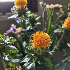 今日のお花🏷️ベニバナ🏵️ 駅前花屋のサービス花束に珍しくベニバナが混じっていたのでひと束購入🥰 黄色の花は翌日には赤みを帯び、その次の日には萎れてしまいました。こんなに短いとは知らず!2024年06月04日📸 だからドライフラワーにするのかな。お姉さんちに飾ってあったドライフラワーを観察すると咲きかけくらいのタイミングで干されているみたいです(2枚目) 😮💡 ̖́-添えてあったスターチス💜、一緒に干すべしってか。サービス花束、奥が深いぜ