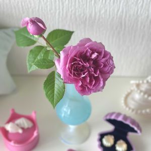 夏の小さなプリマヴィスタのバラを一輪挿しで😌🩷💜