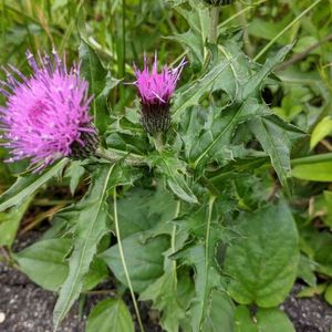 オニアザミ 要注意外来生物、生態系被害防止外来種に措定されている外来種です。 日本のアザミに似ていて花はキレイですが別種です。 全体に針のようなトゲがあり非常に危険な外来種の植物です。 見るからに攻撃的でイカツイです。 見分けのポイント 花の部分も掴んだら刺さりそうなトゲがある (確実にケガします)日本のアザミは花の部分にトゲはありません。 子供が遊んで近づけばケガをしますし、大人が除去しようとしても全体がトゲなので非常に危険です。 拡散を防ぐため種になる前に、自治体に駆除を依頼するなどをお願いします。ご自身で駆除される場合は厚手の手袋も突き刺しますので十分にご注意お願いします。