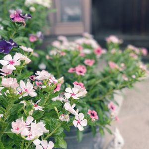 ニチニチソウの寄せ植え 朝夕の水やりが欠かせない💦 *ミラシリーズ 白 ピンク *オリジナルビンカ 紫 *ポルカドットピンク 紫 いずれも北島園芸のビンカ