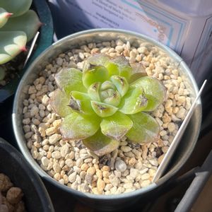 待望の花が咲いたシーソウルB。 葉は春に成長した明るい緑の部分と墨のような黒い部分が はっきり分かれています。 花はピンクかと思いきや、エケベリアらしい内側黄色でした。