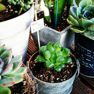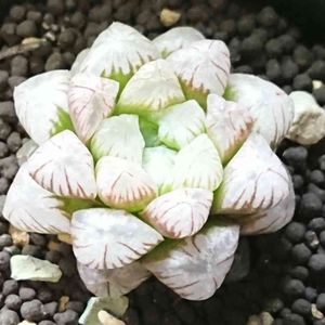 はじめてハオルチア オブツーサを買った時に植え替えた様子です!4年前の写真です。白のプラ鉢に白い砂利型の寒冷紗を表面にまぶしたものです。寒冷紗の下は多肉植物用の土です。 こういうインテリアタイプの植え方に憧れる方もいらっしゃるかもしれないので、主にこんな感じのプラ鉢を使った時のメリットとデメリットについてちょっと書いておきます。 『メリット』 ・見た目が綺麗。 ・水遣りの回数が少なくて済む。 ・人にプレゼントすると喜ばれやすい。 『デメリット』 ・プラ鉢は水捌けが悪く成長が鈍る。 ・室内で育てる場合、光量を確保しないと腐りやすい。 ・プラ鉢内部に熱がこもりやすく、日光浴をさせにくい。 ・表面をデコレーションすると内部の乾き具合を把握しにくい。 ・総じて育成難度が高い。 こういう植え方をするのも全然ありだと思いますが、ハオルチアをどんどん増やしたい方にはこのやり方はおすすめしません。特にはじめてハオルチアを購入された方はまずは株を元気に育てることに注力して、株が増えた段階でこういう植え方をされた方がいいと思います。 ちなみに今はこのタイプの植え方の鉢はうちにありません。全て素焼き鉢でどんどこ増やすスタイルでやってますw おかげさまでどんどん増えましたw カバーに使ってる画像の中心がこの株で周りはみんなこの子どもです。カバーの画像は一昨年のものでさらに増えてます(^^;) この植え方は綺麗であることは間違いないです!だから好きな人にプレゼント〜なんてちょっといいかもしれないですよ(^^) けど相手が植物に全く興味がなかったら...ヤフオクにかけられておしまいですわw 恋も早期終了www もし質問等ありましたらどうぞ!(^o^)