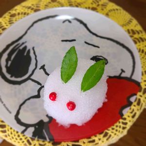🏷️スヌーピーの日 雪ウサギとスヌーピーのお皿 雪ウサギ耳 ツルニチニチソウ 雪ウサギ目 ヤブコウジ 先日降った雪で作ったのですが、2~3日後の雪。雪を固めようとするとまとまらず、苦労しました。 自分も気がつきませんでしたが拡大🔍️すると氷🧊の小さな粒になってました🤔
